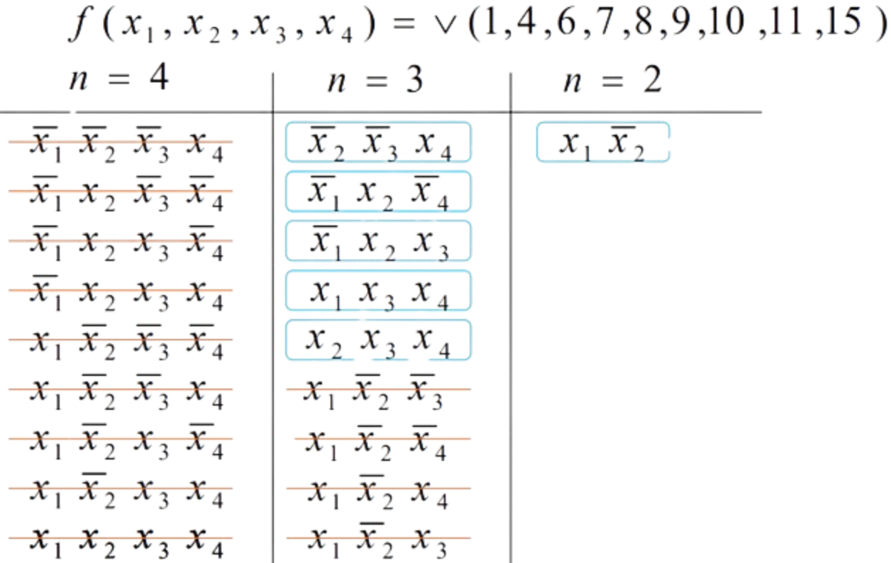 - Poiščemo sosednje konjunkcije, postopek iskanja sosednjih konjunkcij ponavljamo, dokler obstajajo