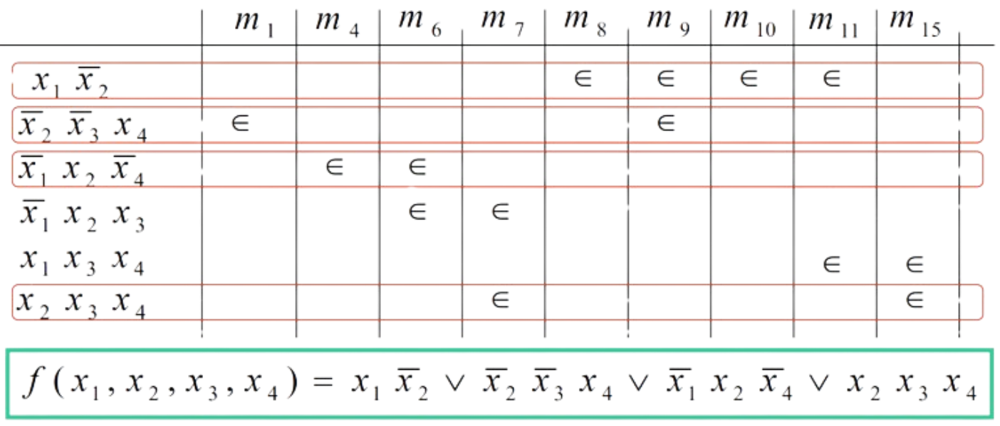 - Poiščemo potrebne glavne vsebovalnike (konjunkcije ki ostanejo), iz potrebnih glavnih vsebovalnikov sestavimo minimalno obliko