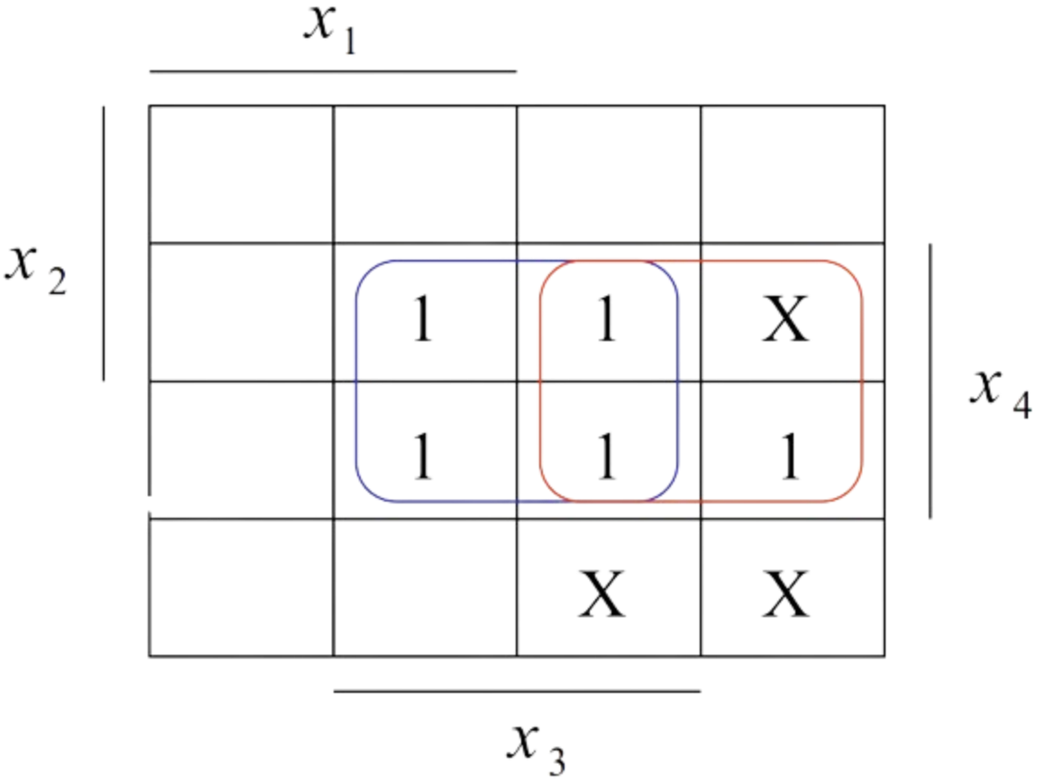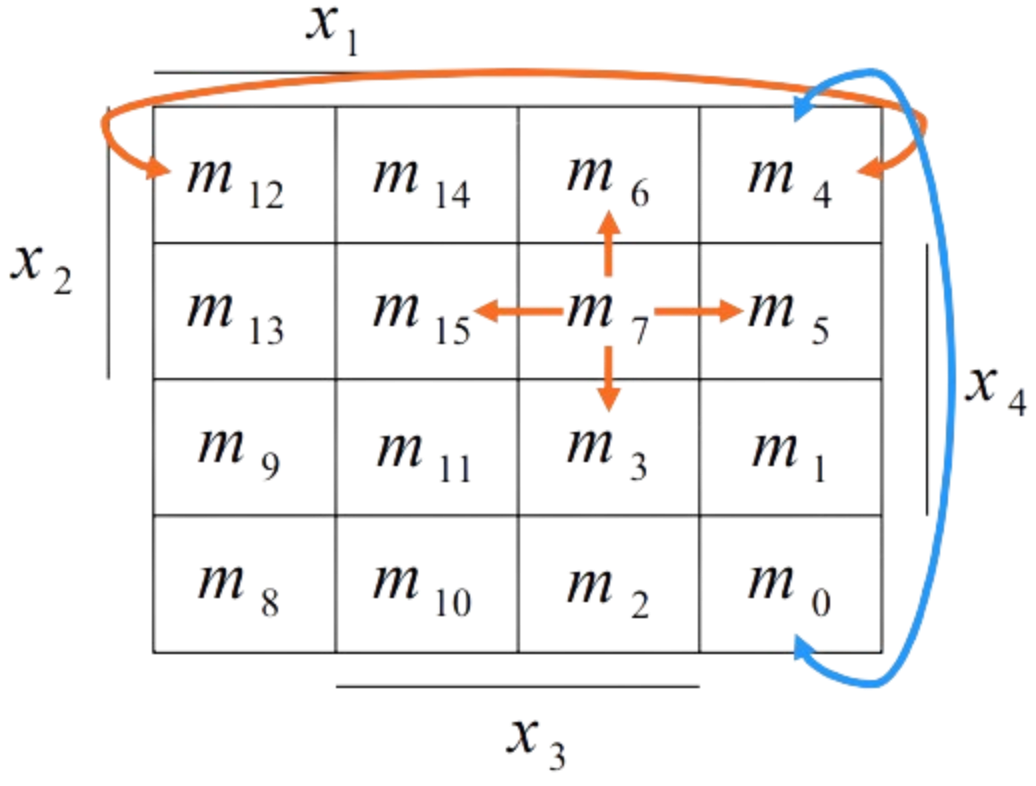 Sosednji mintermi so v Veitchevem diagramu so kar v sosednjih poljih, pri čemer imajo mintermi na robi diagrama sosede tudi na drugi strani diagrama