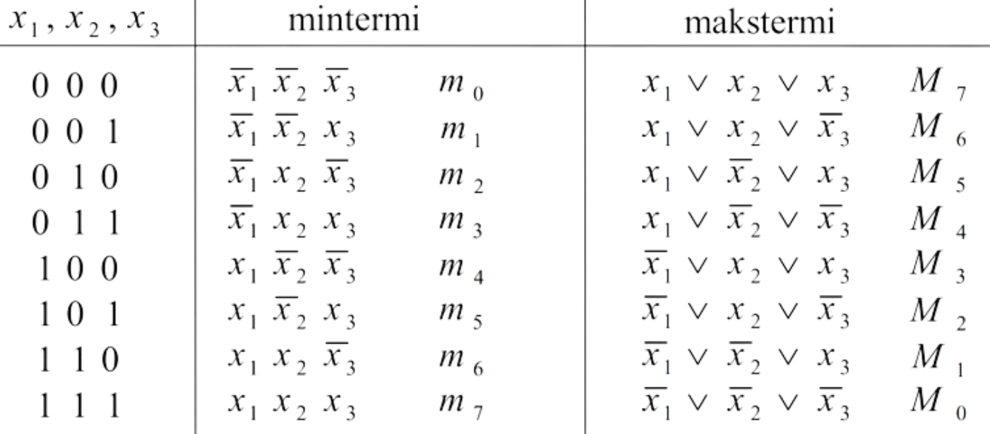 Minterm: Spremenljivke povezujemo s konjunkcijami in uporabljamo negacije