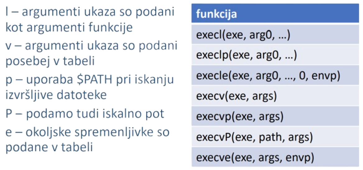Nadomestitev trenutnega procesa - nov naslovni prostor (koda, sklad, kopica, …) in trenutni deskriptor procesa se ponastavi (ohranijo se PID , PPID, odprte datoteke, trenutni imenik, …)