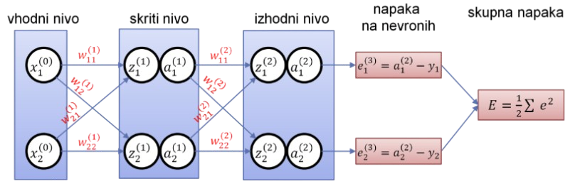 - Vzvratno razširjanje napake od izhoda proti vhodu: izračun gradienta napake za izhodni in skriti nivo