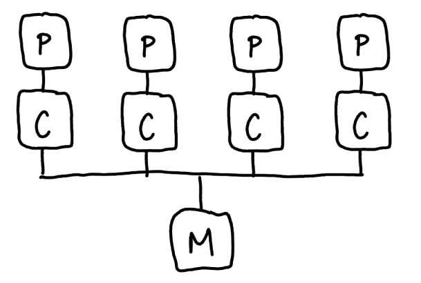 Procesorji si delijo skupni pomnilnik (enovit naslovni prostor) in L2 ter L3 predpomnilnika spremembe v pomnilniku vidijo vsi procesorji