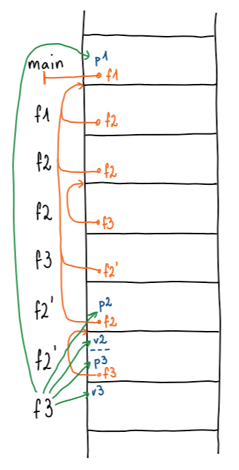 Kof2kličef3pusti na skladu argument in statično povezavo, ki kaže na vrh klicnega zapisaf2